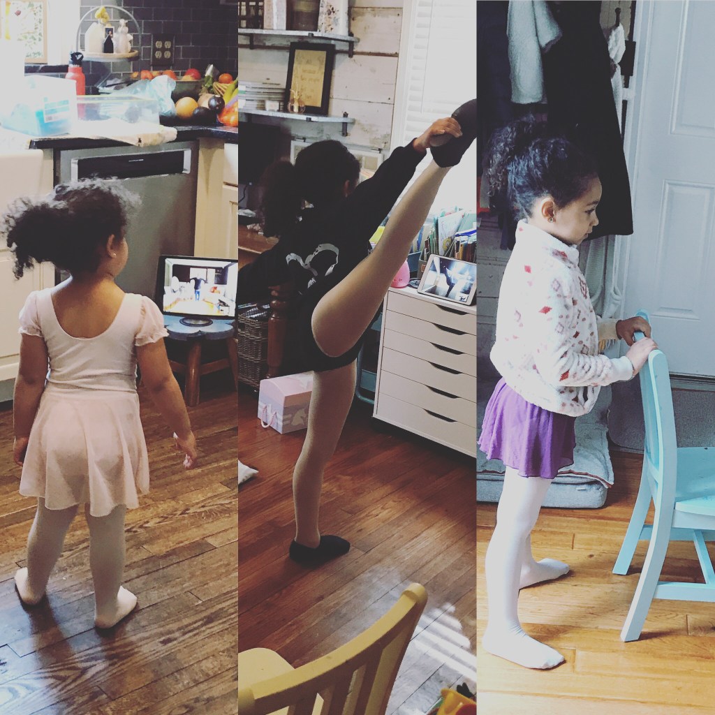 As we waited for ballet to begin, I could feel the nerves coming from Wren. We weren’t quite sure what to expect. When her teacher popped up, Wren’s face instantly lit up. One by one, excited students filled the screen. The class was reunited, virtually. For the next hour, Wren practiced ballet in the playroom, just like she would at the dance studio. Each girl improvised, using a piece of furniture as a bar. The teacher paused and gave each student feedback, checked in, and asked questions. She was happy to be there with her students. It was pretty amazing.