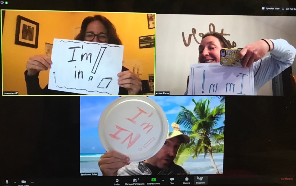 Dawn, Peter, and I taking a silly picture, on Zoom, letting know our school community that we were ready to take on the new Notebook Challenge.