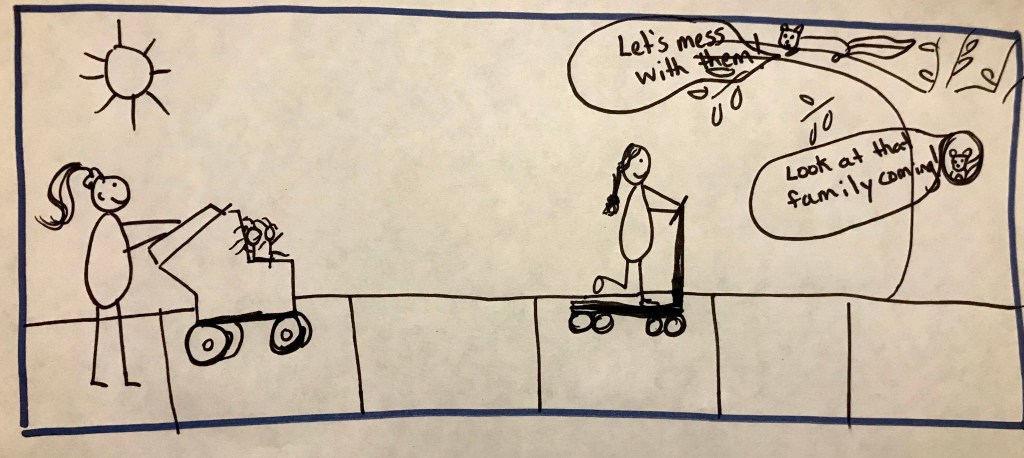 One day this week, I took the girls on a walk…a reoccurring strategy I use to quiet everyone down, kill some time, and at times, tire them out. Sometimes, we just need get away from home. On this particular day, Wren was scootering ahead of me as I pushed Adi and Rose in the double stroller. As I approached a tree, I heard a rustling, just as Wren rolled by. I stopped in my tracks, expecting maybe a bird to be falling through the leaves. We were all surprised to see a squirrel land on his back, right there on the sidewalk. As we stood frozen, the squirrel got to his feet and fled for a nearby tree. We were all left thankful that the squirrel didn’t land on us!