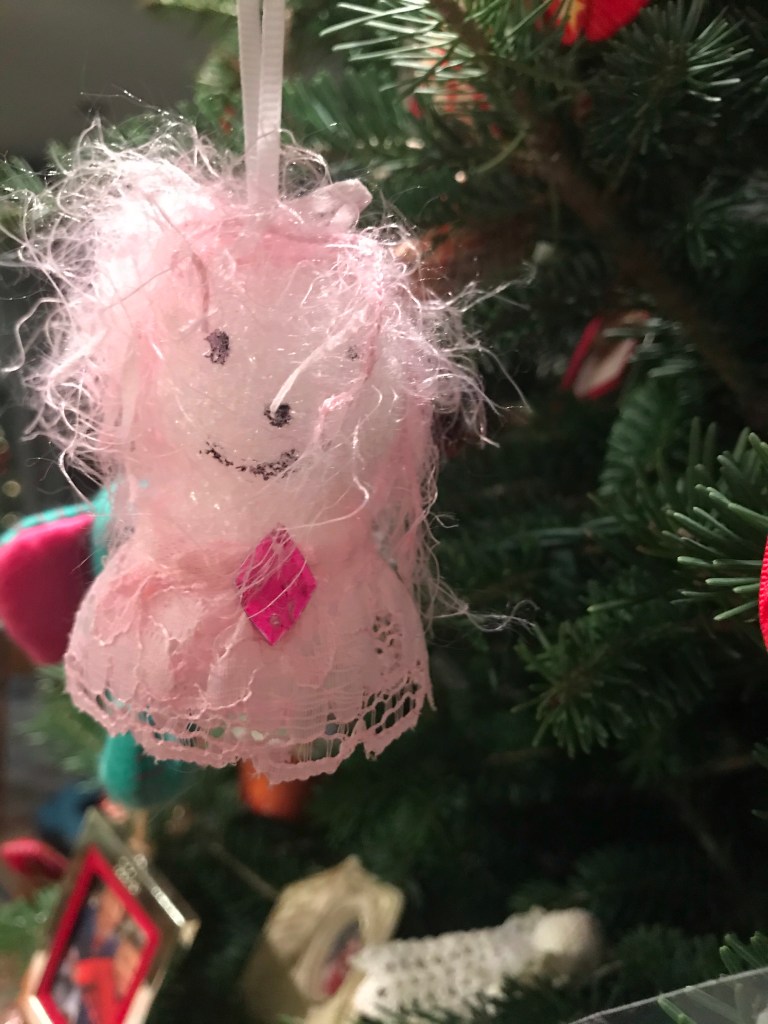 Then, there is Sophie’s angel, my favorite ornament on the tree. It was gifted to me ten years ago now, by Sophie, my then first grade student. I remember when she gave it to me, the proud look on her face as I carefully unwrapped the treasure. A Styrofoam ball with a beautiful face created with marker, a fine lace gown, all topped off with the most fantastic baby pink hair. Every year, as I hang this ornament in a prominent place on the Christmas tree, I remember the beauty in giving and receiving. These small treasures hold so much meaning, sweet reminders of our stories and the people that have touched our lives.