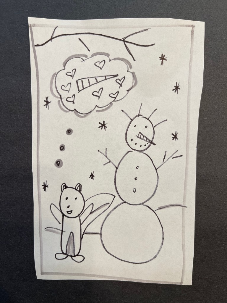 8. Love the Squirrel Chronicles! We have many bird feeders, so we also have many clever squirrels. Loved your description of the squirrel trying to use the slide to take the carrot back to the fort. They are not only clever, squirrels are determined and seem to have the never-give-up attitude about things. Loved your drawings, too. A great way to start my day – thank you!