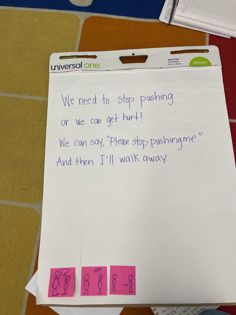As teachers finished up their small groups, generating topics, we informed them of our next plan. While the rest of the class went outside for recess, we were going to keep two volunteer writers in to write a song using one of the brainstormed ideas. This is something they learn to do in their writing unit. Two eager little writers willingly stayed in. They began by choosing a problem they wanted to write about and then thinking about solutions. After talking out ideas and sketching their plans, they hummed the tune to Happy Birthday To You. Then, one line at a time, they drafted the song below, all about convincing others to stop pushing friends at recess. At one point, all the teachers and these two lovely children were all happily singing the words to their new song.