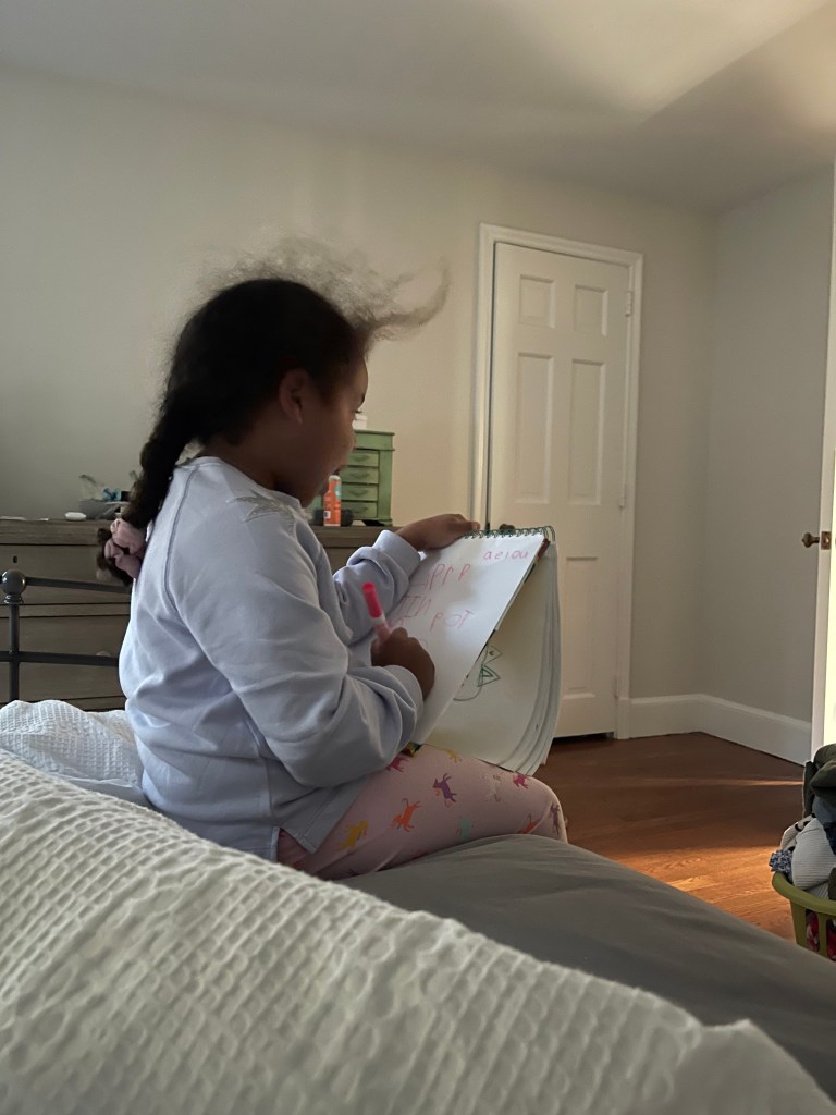 As Rose held up her paper again, I once again marveled at all the ways she is growing as a writer. Five weeks ago, she couldn’t segment words and she didn’t know what a vowel was. Today, she’s walking around segmenting and blending words, eager to hear sounds and write them down. I’m grateful for her excitement and the way the world is opening up for her. I’m also grateful for all the wonderful things I know are happening in her kindergarten classroom.
