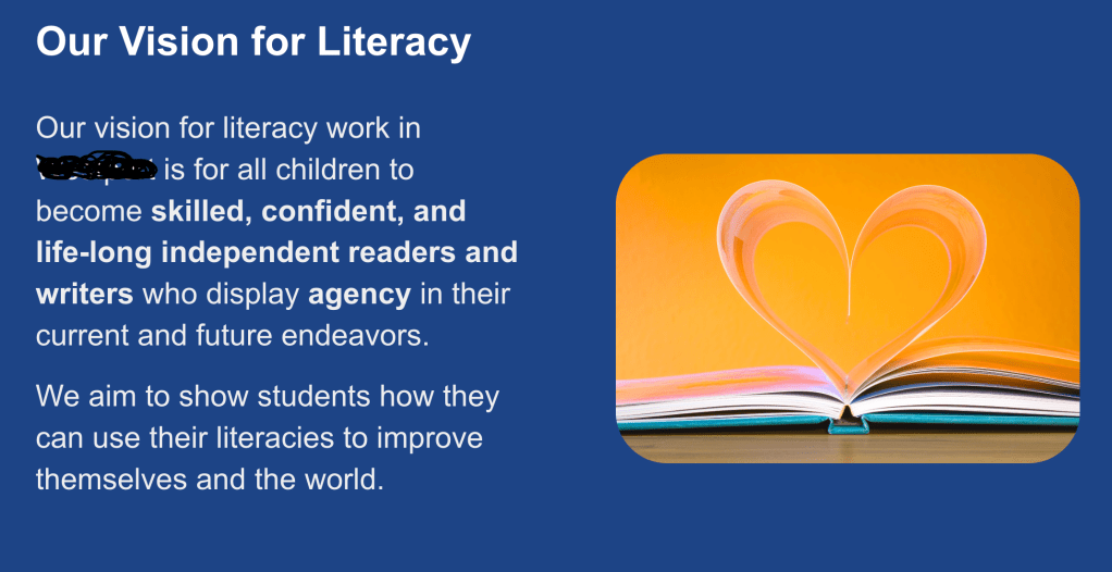 Today, I’m just writing to think. To process and grow ideas. This is what we teach kids to do. We also teach them to read in order to think. We don’t teach them what to think, but how to question and grow their own ideas about the things they read. I helped to write the vision of literacy for our school district, shown below. That is the literacy work I strive for every day.