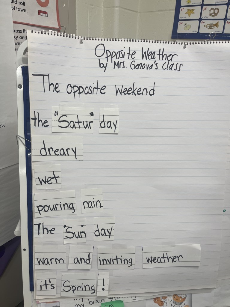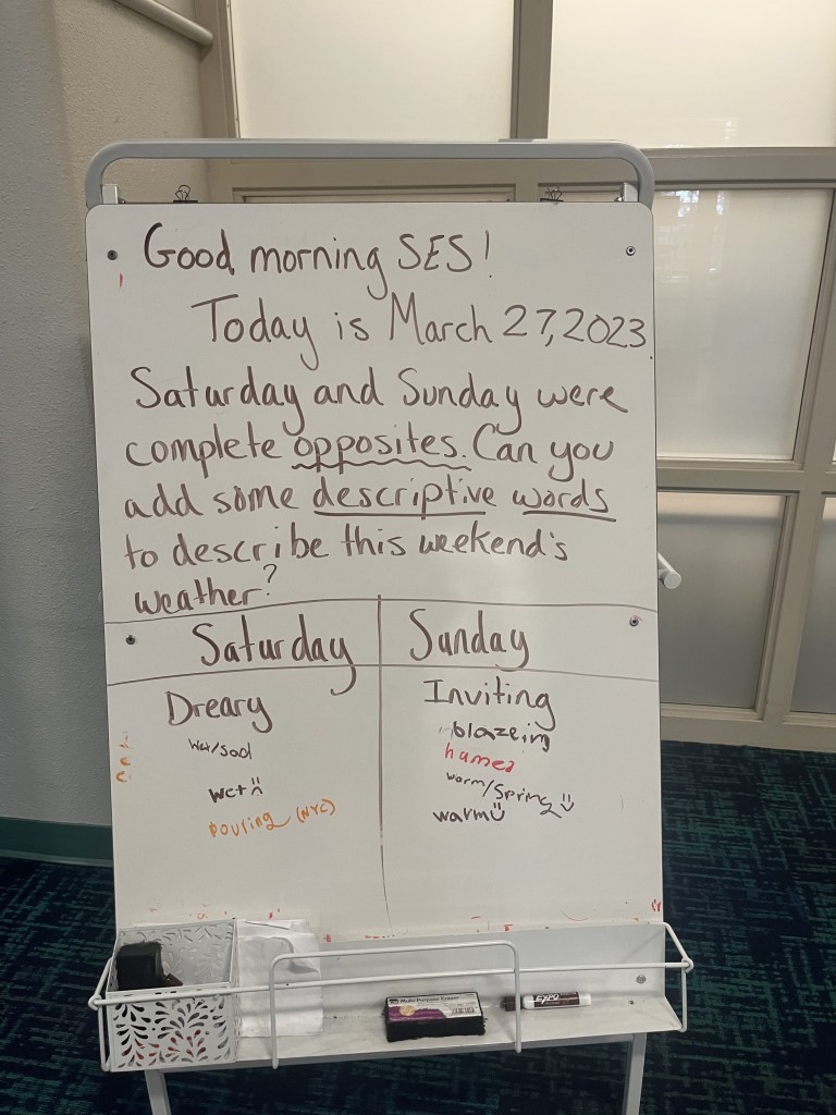 I love the way that poem grew from SOL seed to whole-school message to poem to us. I also love how Satur -day sounded like “sadder” day or maybe they were thinking of ‘saturated” day and then became a “sun” day. Very nice.