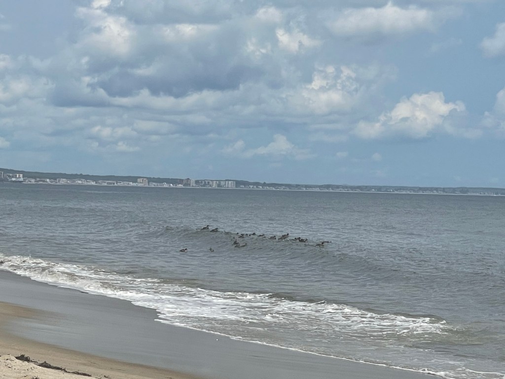The next day, the seaweed was gone but the tide was high. The girls delighted in jumping the waves, feeling them crash down around them, and even catching a few rides back to the shore.
