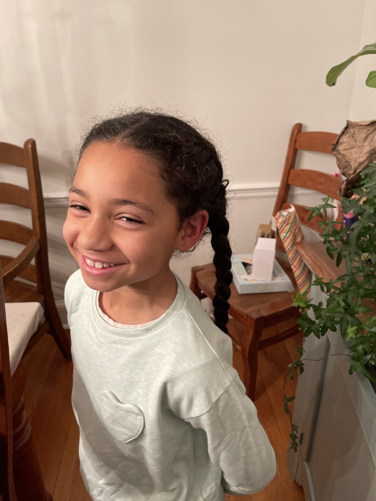 We watched a video together. She giggled with anticipation as she sat sideways in a chair at our dining room table. I separated the strands and replicated the moves I had just observed in the video. To my surprise, a braid began to form. I quickly realized that I should have been gathering larger strands of hair because when I got to the base of Adi’s neck, there was still a lot of loose hair. I improvised, gathering more hair together to form a long braid down her back.