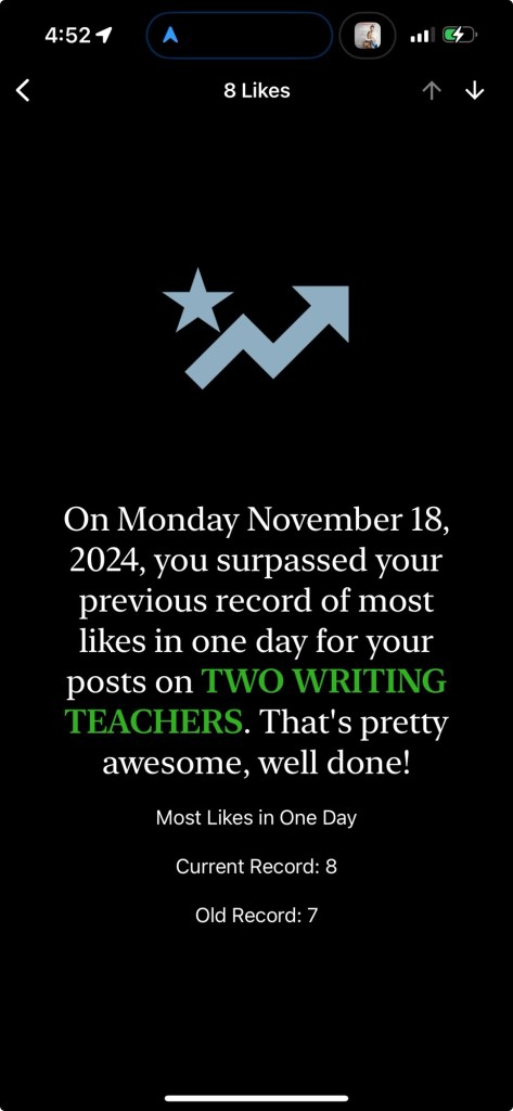 After school, a quick check to Jetpack gave me one more celebration to share with Karen. I texted this photo to her, along with the message “Tell them their writing is breaking records! 🤣”