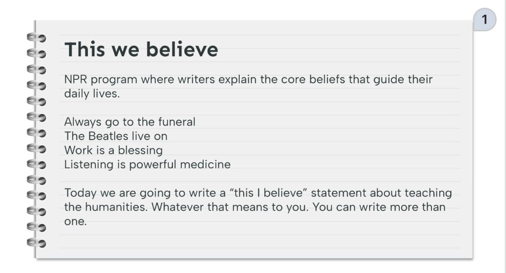 During the meeting, the committee leader, Ali, asked us to brainstorm a “This I Believe…” list to help us begin a conversation around what we value and what to prioritize in our district. Here is her invitation with a few of her own examples: