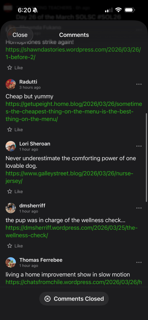 Your commitment is beyond! Amy and I had the same issue with the Jetpack app and the WordPress reader today. It wasnt just you! I noticed it this morning when I went to post my slice to the TWT post. I was able to do so by going straight to the site.